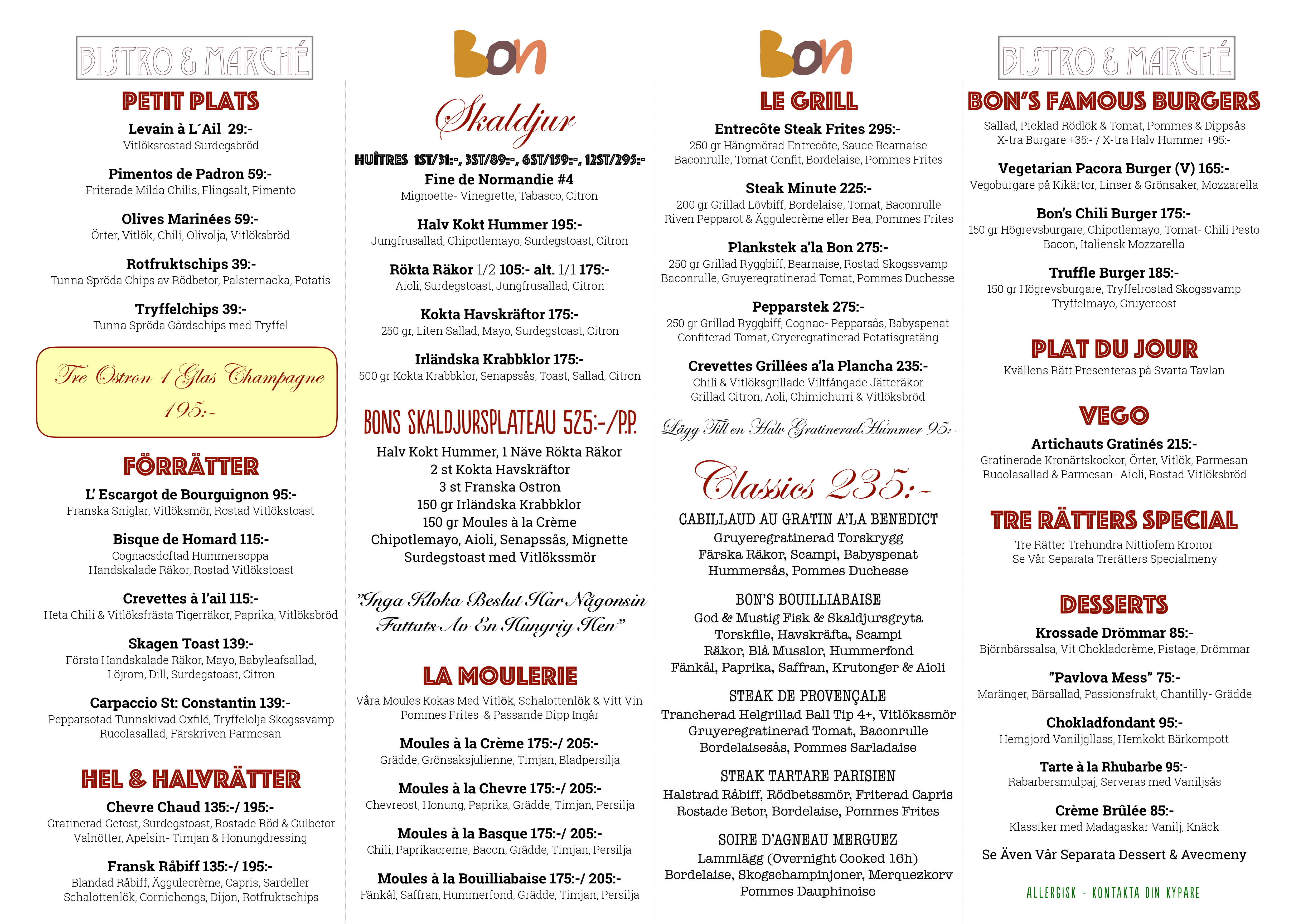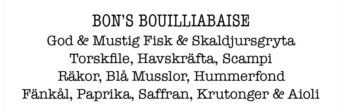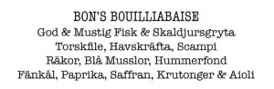 N’en déplaise à certains, il est parfois — voire souvent ! — agréable de déguster des bons plats français même en vivant en Suède. Avec un accueil chaleureux, en français, et une carte impressionnante Bistro Bon offre une parenthèse bleu-blanc-rouge à Södermalm. Et même les fautes d’orthographe donnent le sourire :