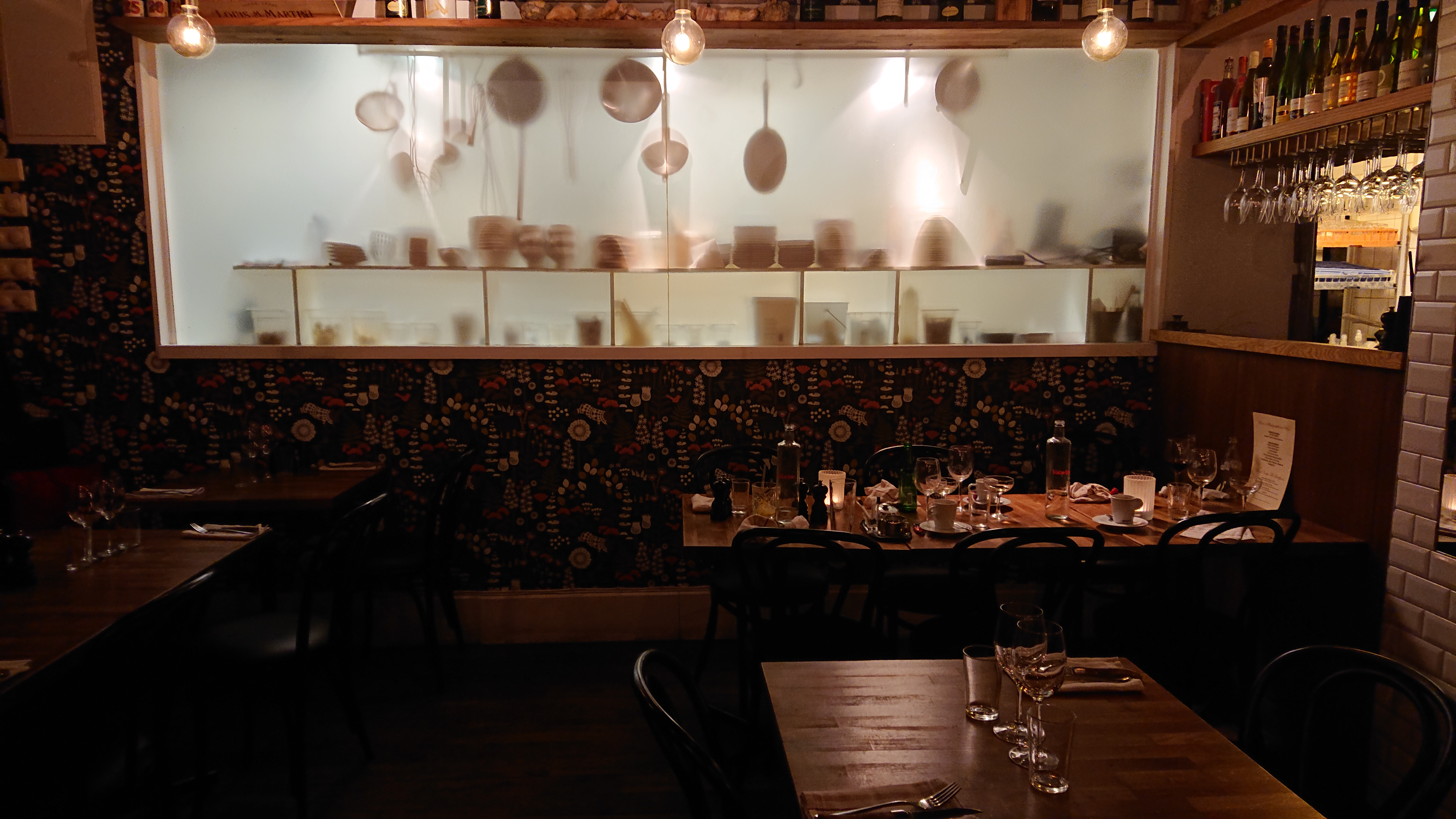Il faut d’abord traverser le bar donnant sur la rue, pour accéder à la salle de restaurant avec fenêtres sur cour. La décoration est à l’image de la cuisine : à la fois traditionnelle avec ses tables rapprochées et ses banquettes, mais avec un zeste d’originalité, comme les murs en faïence blanche style « métro parisien » ou la très réussie fenêtre en verre dépoli entre la salle du restaurant et la cuisine, qui donne à voir les ustensiles en ombre chinoise. Et pour régaler vos oreilles, une playlist française !