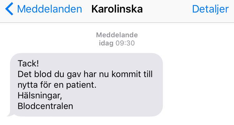 Mais vous recevrez votre plus belle récompense par SMS quelques semaines plus tard, quand un patient aura reçu votre sang. Voilà un petit geste génial qui ne coûte pas beaucoup au Blodcentral, qui encourage les donneurs de sang à revenir, qui a leur tour, potentiellement, partagent ce sms sur les réseaux sociaux, et recrutent ainsi quelques nouveaux donneurs !