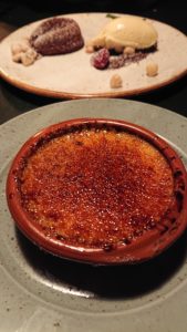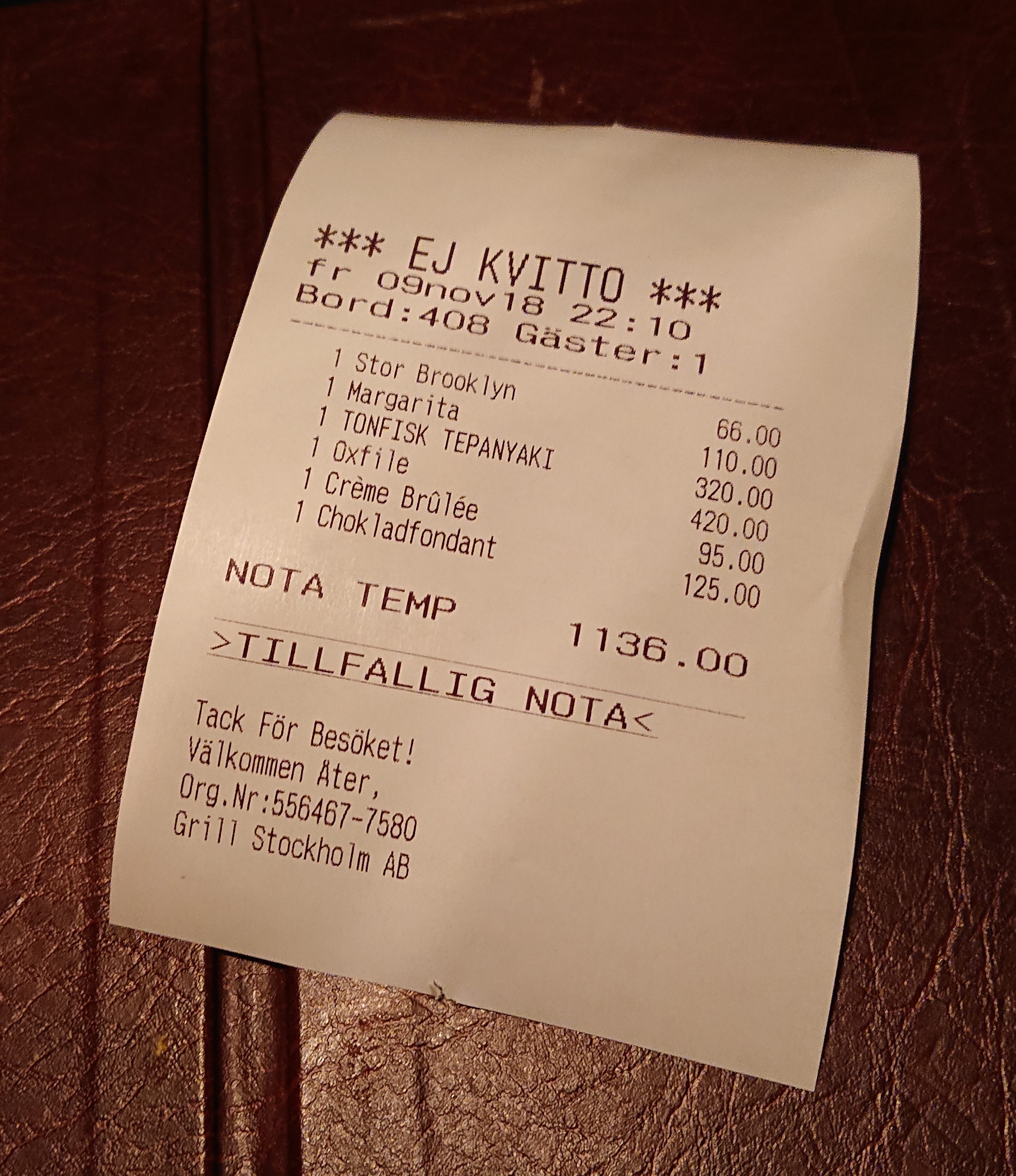 En dessert, pour finir avec une note sucrée, la crème brûlée (95 kr) — sans faute d’orthographe sur le menu, fait rare — mérite vraiment d’être goûtée. La croûte est craquante à souhait, la crème bien vanillée ; seul minuscule bémol, la consistance. Après le bœuf Wagyu, il faut également savourer chaque bouchée du très bon fondant au chocolat mais très petit et très cher (125 kr)… et à ce prix-là les noisettes entières pourraient au moins être concassées !