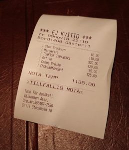 Le restaurant n’offre pas un grand choix de mets suédois, à part les löjrom (oeufs de poisson d’ablette) en entrée et les varma hjortron (fruits de la plaquebière, appelée aussi ronce des tourbières, en français) en dessert… et c’est tant mieux.