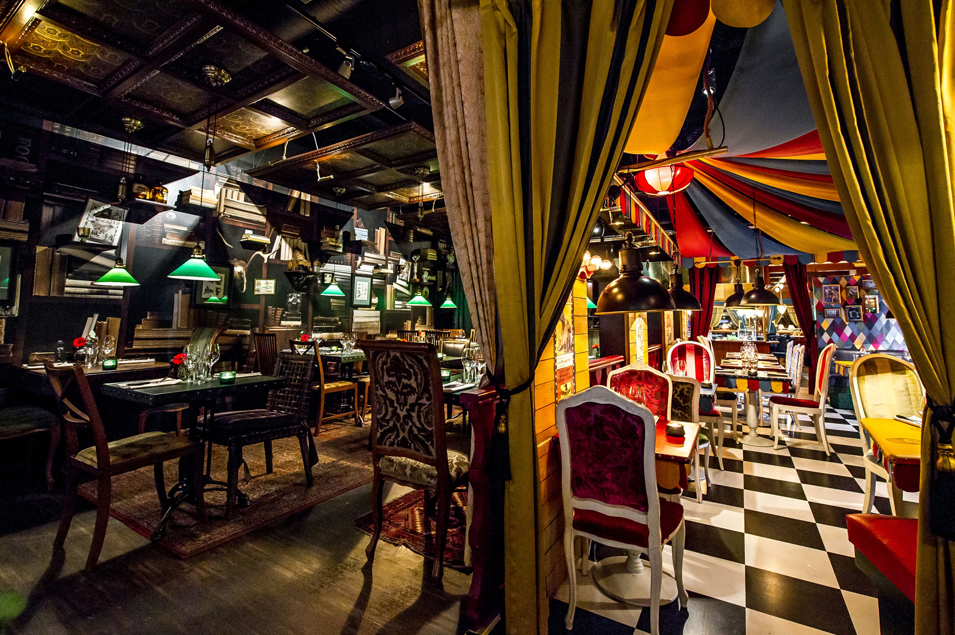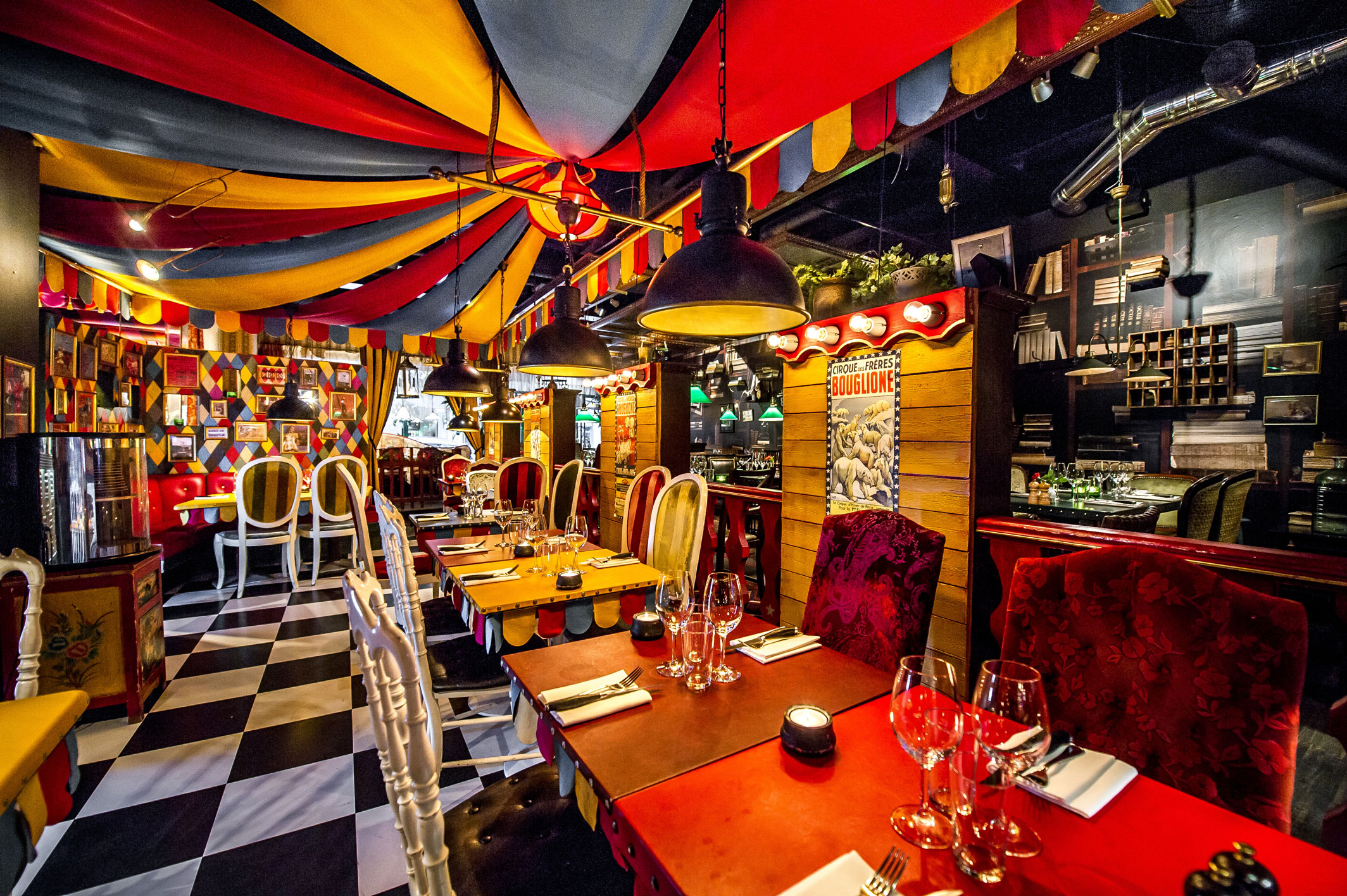 Ouvert en 2003, le restaurant offre 9 décors différents permettant à ses convives de s’asseoir à bord de l’Orient Express, sous un chapiteau de cirque, dans une bibliothèque ou encore dans une cabane de chasseur. Dès l’entrée, les couleurs vives et la lumière tamisée créent une ambiance originale et surprenante. Un ballet de serveurs s’active entre les carcasses suspendues dans une armoire réfrigérée vitrée — servant à la maturation de la viande — et les poissons colorés et bien vivants d’un aquarium décoratif.