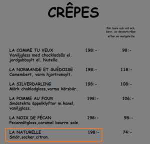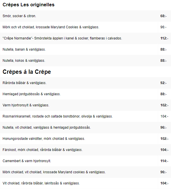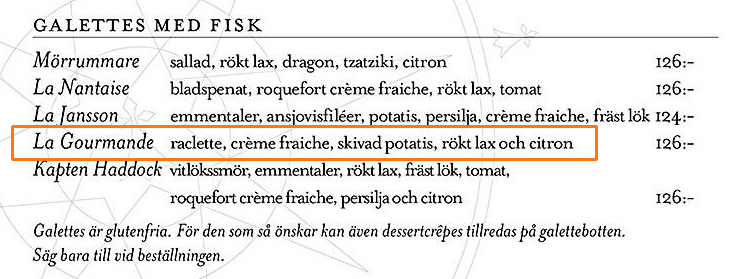 Au menu, un large choix de galettes et de crêpes, plus typiquement françaises que les deux crêperies précédentes, avec en particulier du fromage à raclette et de la saucisse de Montbéliard, mais avec également pas moins de huit galettes végétariennes pour satisfaire les Suédois. Les plus curieux opteront pour les galettes au poisson avec des associations de fromage surprenantes comme la Gourmande au samon fumé et raclette !
