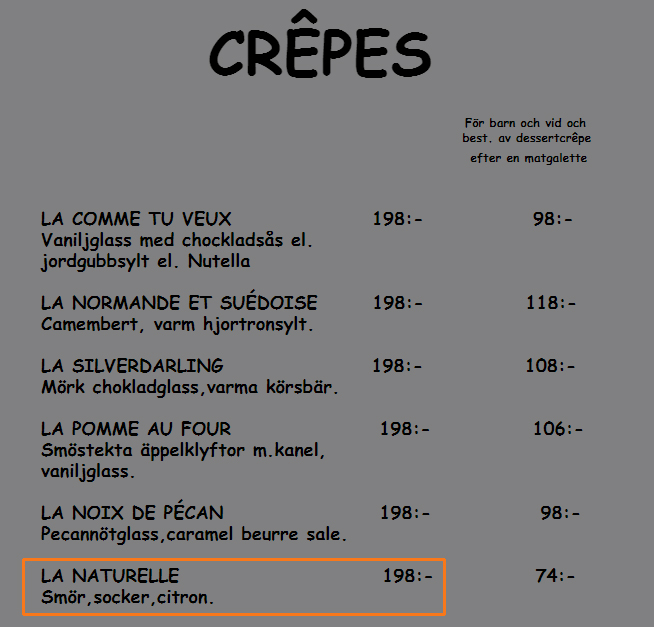 Côté dessert, la beurre-sucre affiche un mini prix à 52 kr, et les plus élaborées telles que Belle Hélène, Amandine ou Pêche Melba ne dépassent pas les 100 kr.