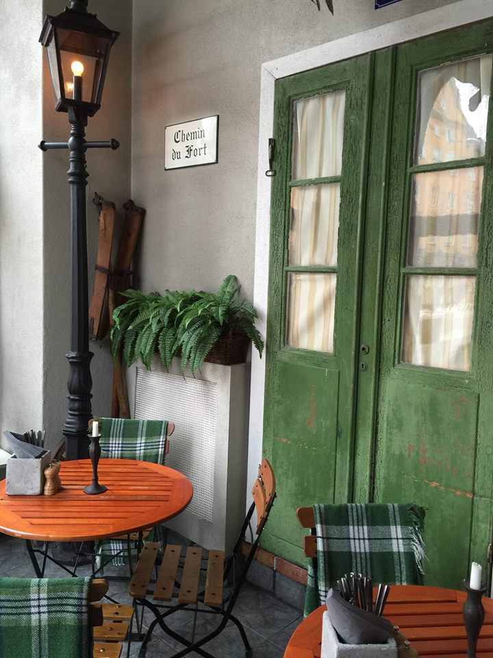 La déco façon brocante française est très chargée, très cliché. Préférez une des tables devant les fenêtres. Les tables et chaises de jardin sont peu confortables, les plaids ne sont pas mis à votre disposition pour vous réchauffer mais pour soulager votre postérieur délicat !