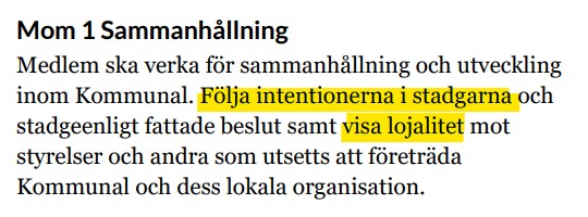 « Le membre doit travailler à la cohésion et au développement au sein de Kommunal. [Il doit] suivre les intentions des statuts et des décisions statutaires ainsi que faire preuve de loyauté envers les conseils d’administration et toute autres personne nommée pour représenter Kommunal et son organisation locale.