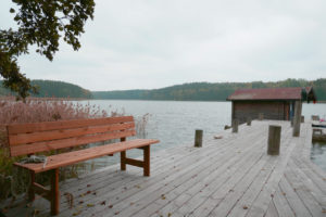 Contourner ensuite le lac et prendre un peu de hauteur, avec quelques rochers lisses sur le chemin, puis redescendre pour sortir de la forêt et rejoindre une route de terre au milieu de champs. Franchir le portail sur la gauche (+0h50). En haut de la colline [4] (+0h55), au niveau de la ferme, prendre à gauche, puis rapidement le sentier sur la droite (flèche et points de balisage orange) et traverser de nouveau une route. Continuer dans la forêt, passer par le lieu-dit Pusshuset (+1h15), avec un banc pour se reposer (!), avant de sortir de nouveau de la forêt et marcher ensuite sur le bord d’une route, vers la gauche. Dans le virage, emprunter le large chemin de terre et atteindre la mer ! [5] (+1h30) Il s’agit en fait d’une petite baie appelée Eke fjärd (qui n’est pas un fjord !) bordée de roseaux, qui rend l’accès à l’eau impossible… à moins de jeter un coup d’oeil vite fait en prenant le chemin sur la droite après la grange rouge, menant à deux pontons privés (accès interdit).