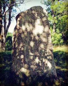 A la première intersection quelques mètres après le panneau de Hansta naturreservat [1], aller voir la pierre gravée datant de l’époque viking avant de prendre à gauche direction Jakobsberg. Des explications sont disponibles en suédois.