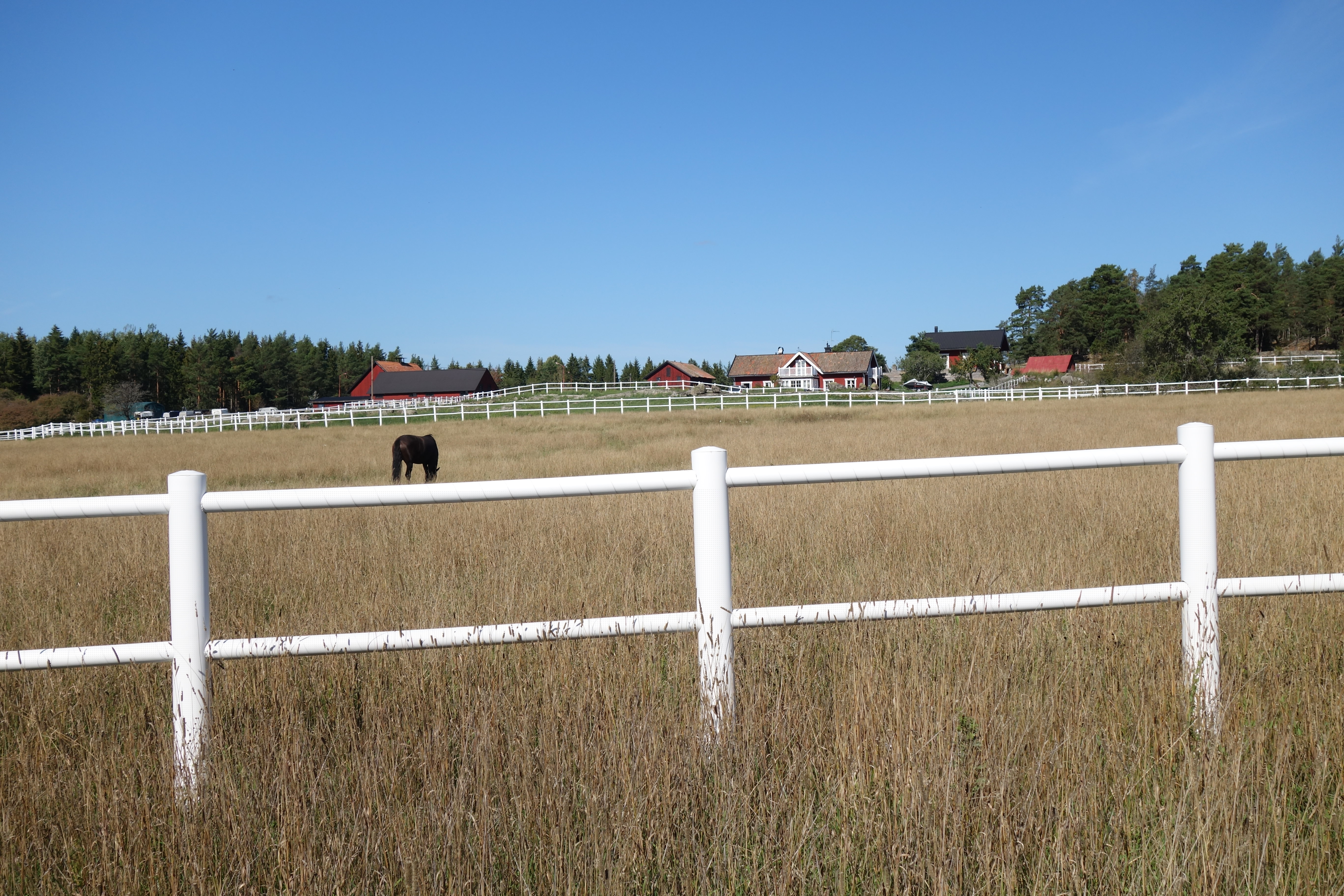 S’accorder une dizaine de minutes de pause au bord de l’eau (sur un ponton privé… mais chuuuuut !), puis après avoir longé un champ, quitter le chemin orange (+3h15) pour contourner par la gauche la maison et son garage, et rejoindre une route en graviers. À l’intersection avec Lindöbrovägen, prendre à gauche et au bout tourner à droite sur Tillflykten.