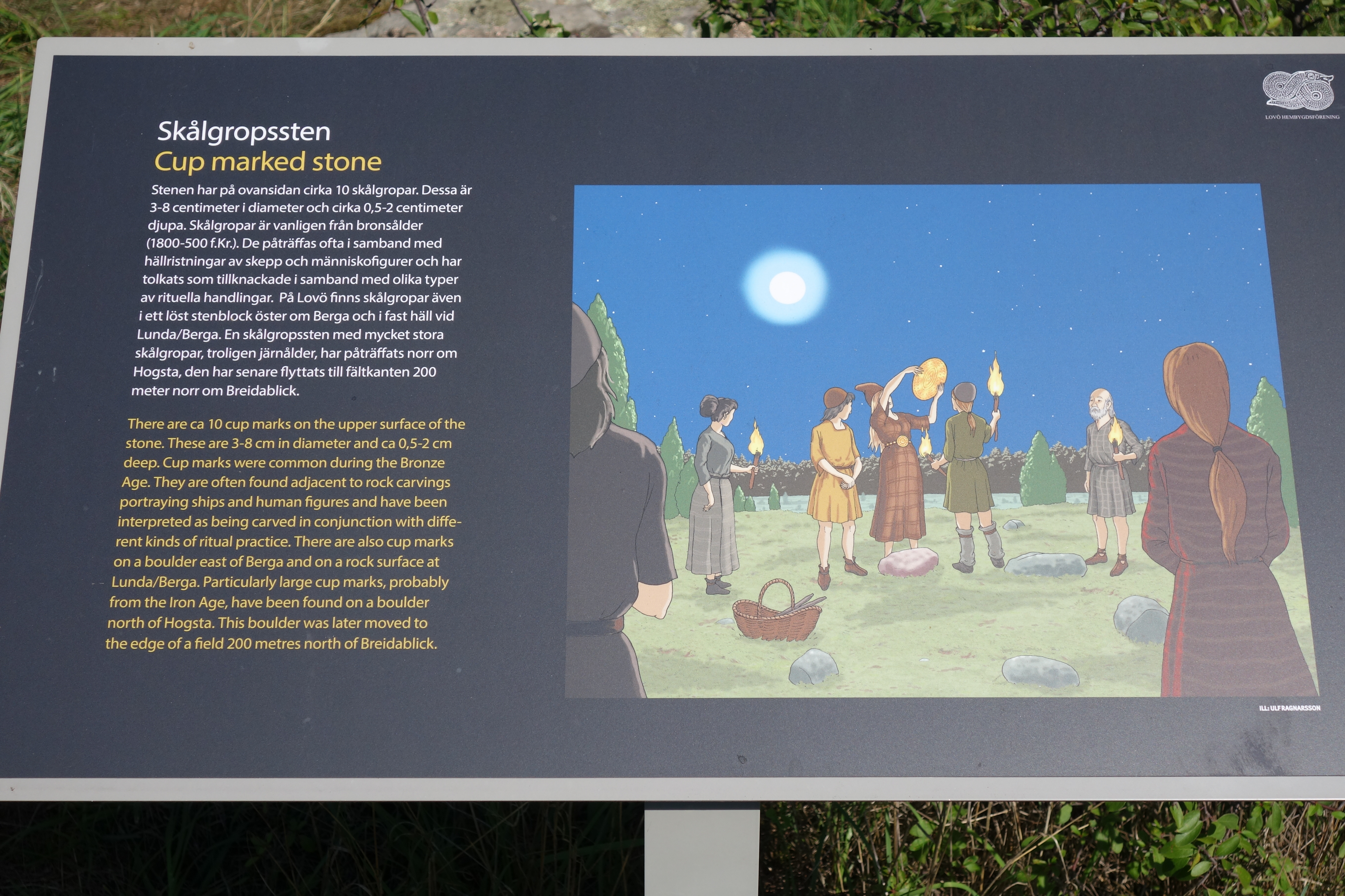 Le chemin emprunte principalement le Fornstigen, un parcours avec de nombreux sites historiques : ruines de maisons, défenses anti-aériennes datant de la seconde guerre mondiale, cimetières vikings… D’intérêt souvent limité, les ruines ou traces actuelles sont heureusement accompagnées et mises en valeur par des panneaux explicatifs récents, avec des textes en suédois et en anglais, et surtout de précieuses illustrations :