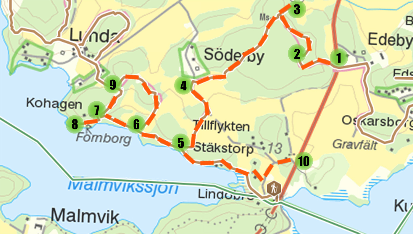 Les points d’intérêt majeurs du parcours sont numérotés dans le texte et sur la carte. Les temps indiqués entre parenthèses sont calculés à partir de l’arrêt de bus Lovö Edeby.