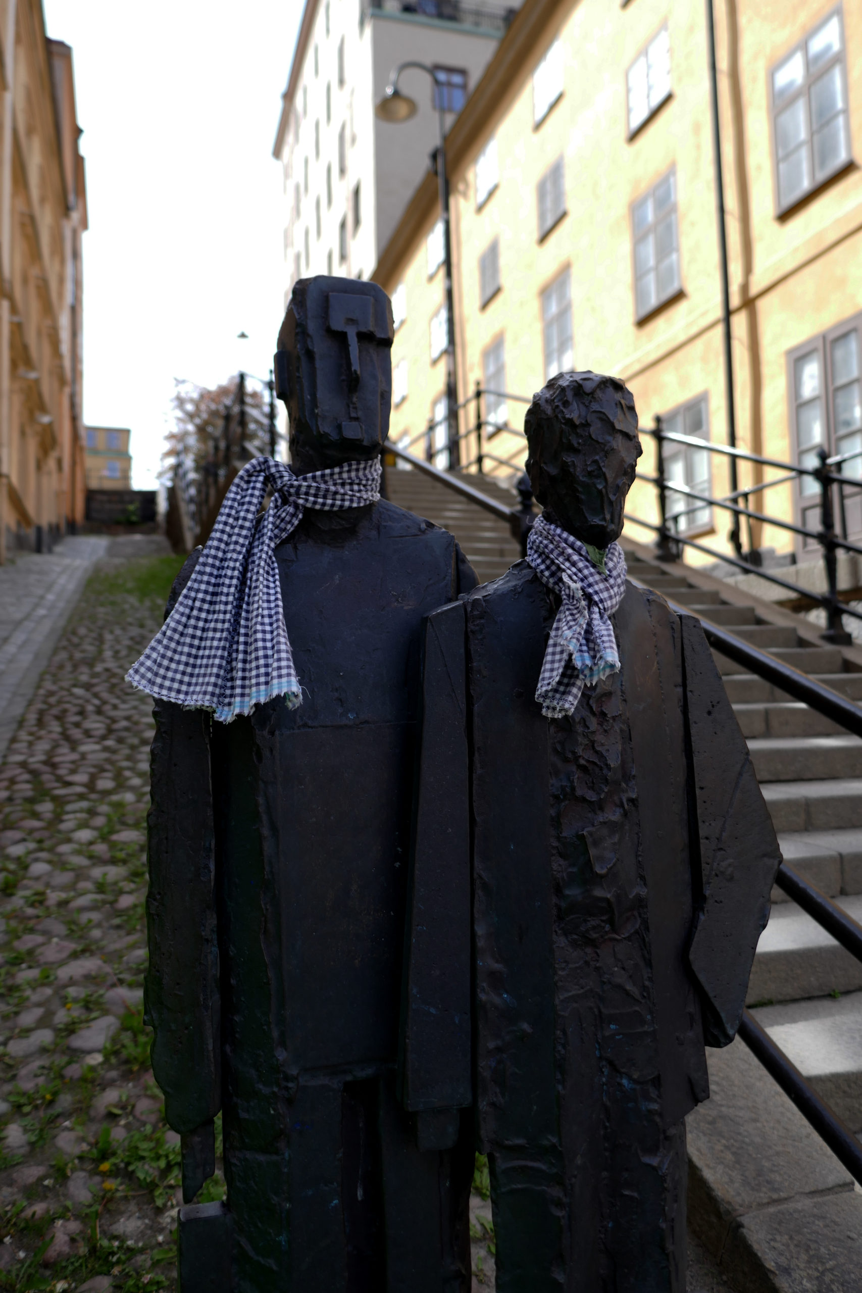 Au pied des marches [2], saluez les deux hommes de bronze couverts d’une écharpe de laine en hiver ou d’un foulard en été, au pied de l’escalier monumental et très photogénique de Pustegränd. Puis prenez la deuxième rue à gauche en descendant en direction de l’eau : Bastugatan.