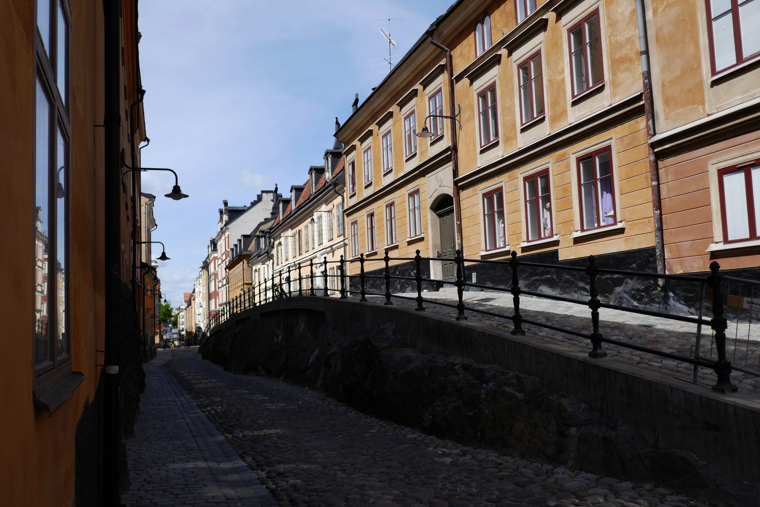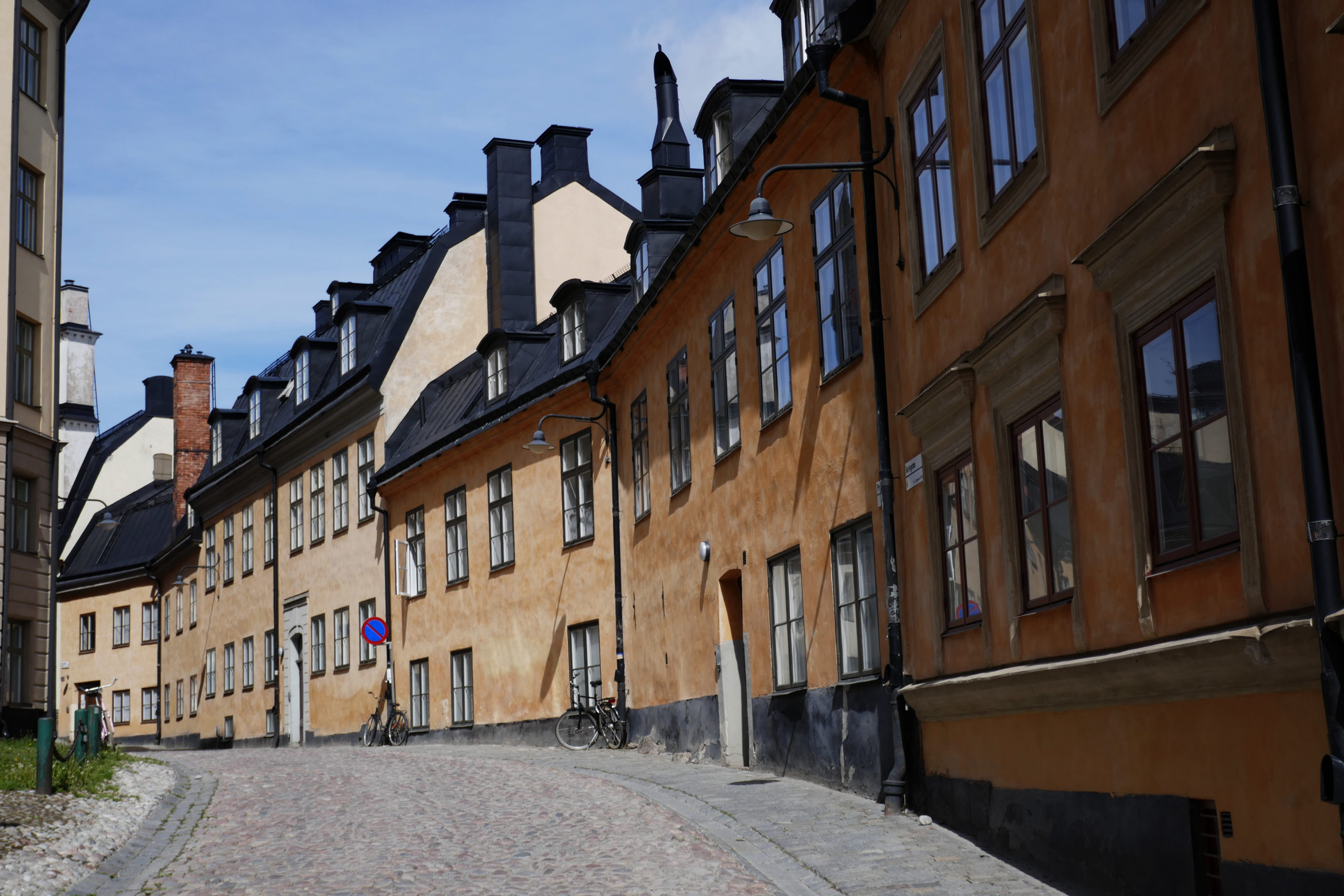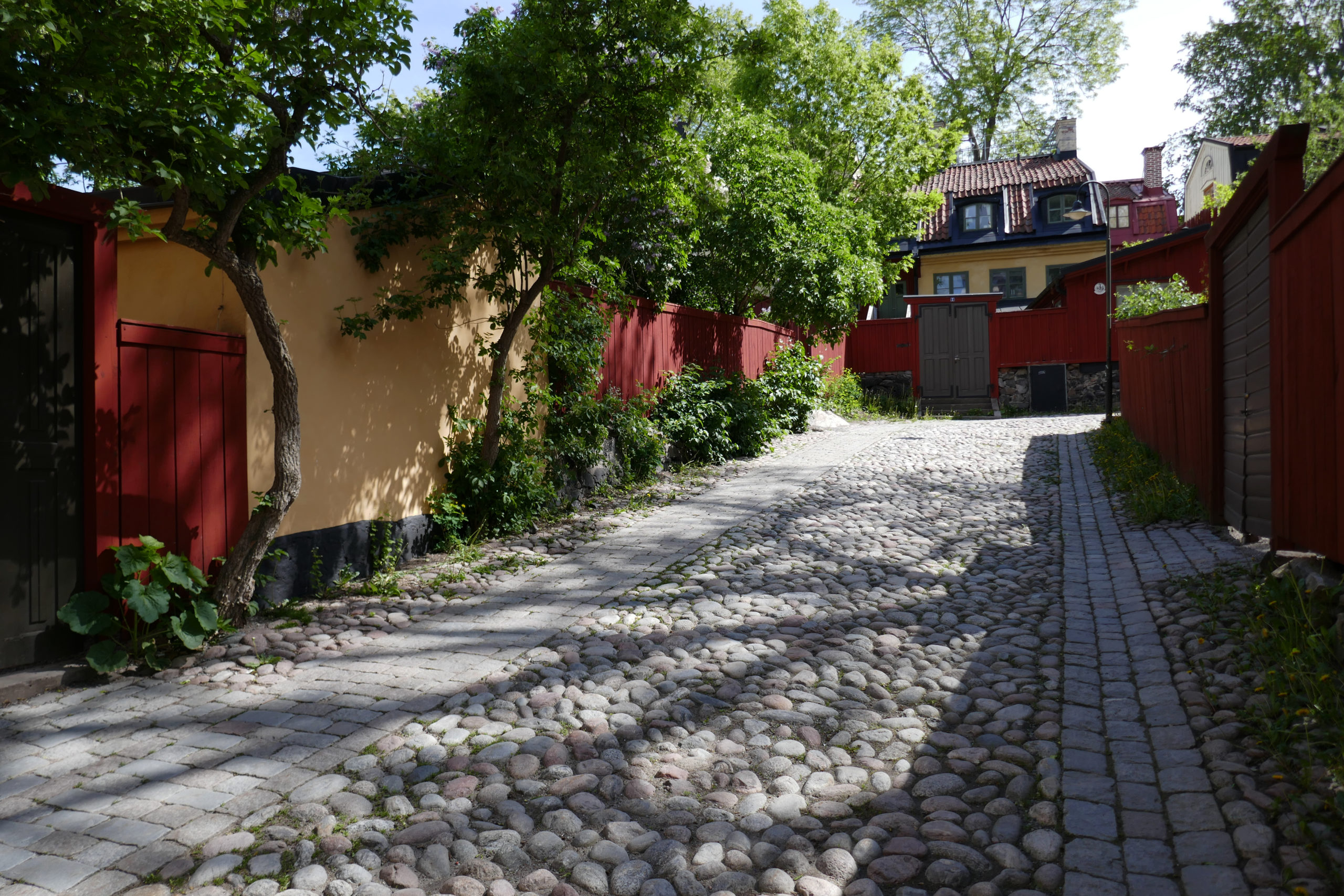 Lorsque la rue se divise, continuez naturellement à gauche ; le superbe arbre de la place (panneau explicatif) a malheureusement été récemment abattu. Au carrefour suivant, prenez à gauche la rue Bellmansgatan — encore — en pente et faites un aller-retour jusqu’à l’une des rues les plus photographiées de Stockholm : Brännkyrkagatan [3].