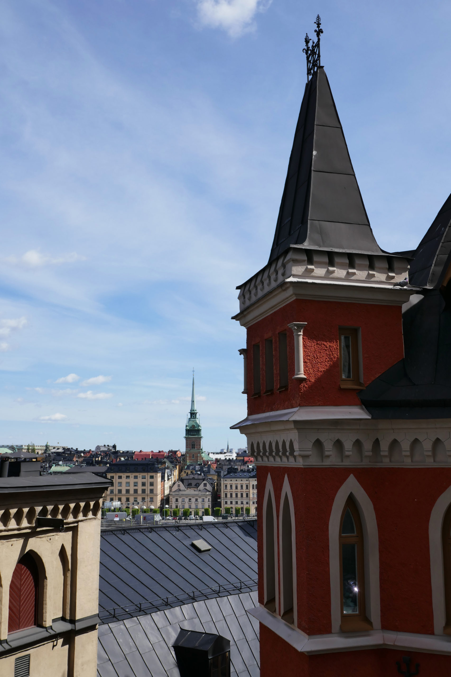 Faites demi-tour pour emprunter la passerelle métallique enjambant Bastugatan. Ignorez pour le moment le panneau Monteliusvägen et laissez votre curiosité vous pousser jusqu’au bout [4] (un cul-de-sac depuis la fermeture de l’ascenseur Mariahissen) pour admirer rapidement sur la droite le bâtiment ocre et sa tourelle d’angle, et une jolie vue cadrée sur la vieille ville Gamla Stan, dominée par la flèche de Tyska Kyrkan.
