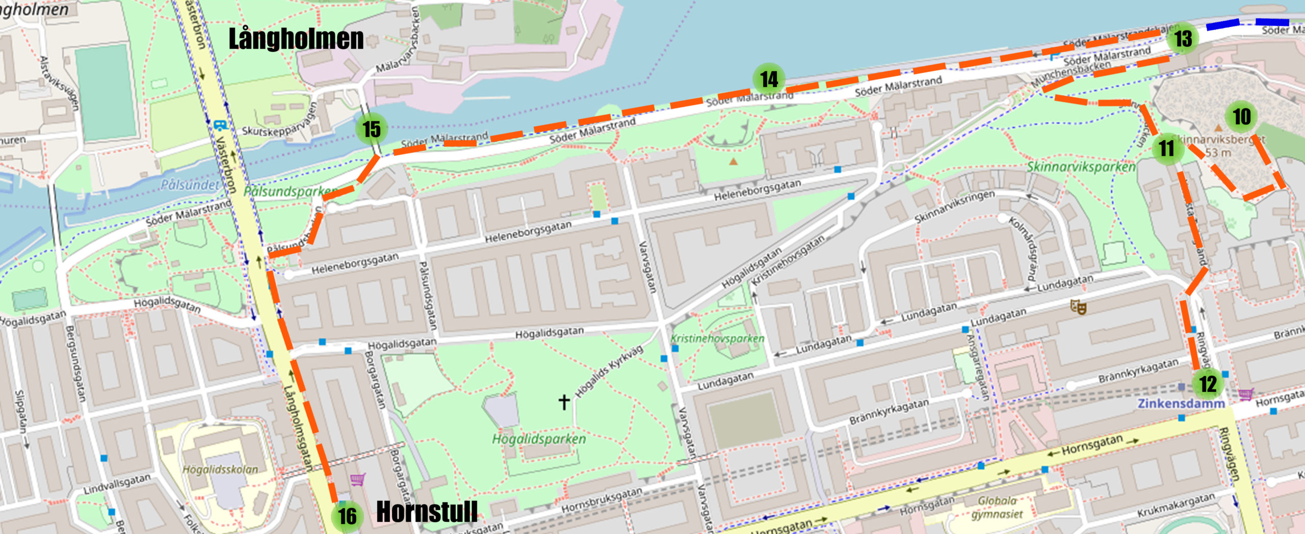 Pour ceux qui veulent continuer l’exploration plus à l’ouest de l’île, descendez par l’un des chemins du parc jusqu’à Heleneborgsgatan, et continuez alors la descente sur la droite pour profiter d’un des rares passages cloutés traversant la très passante avenue Söder Mälarstrand [13].