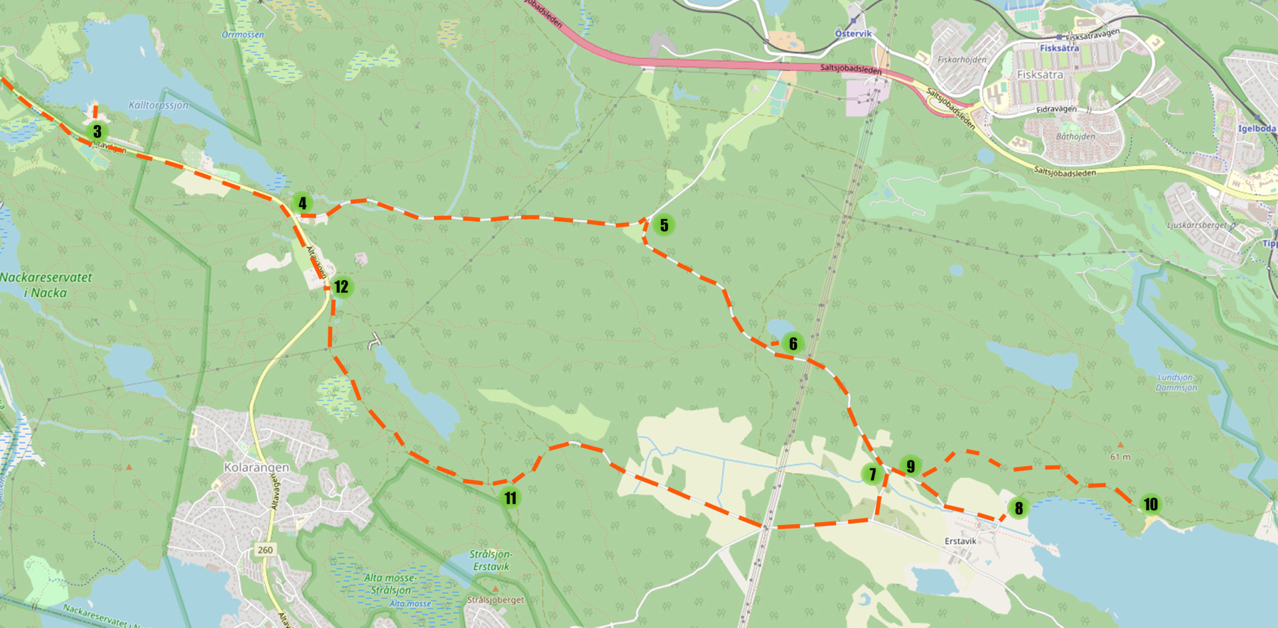 Depuis Slussen[1], passer sous le pont doré et prendre la piste cyclable qui longe les quais en passant par Fotografiska et le terminal de croisière, et qui traverse ensuite le pont à bascule Danviksbron. Suivre les panneaux direction Nacka jusqu’à croiser le tramway [2] (+0h15) : repérer le panneau Hellasgården en face, traverser les voies du tram, puis traverser à gauche. De l’autre côté de la rue, continuer à droite (pas de panneau !) : la piste cyclable devient un trottoir partagé, suivre désormais les panneaux Älta.