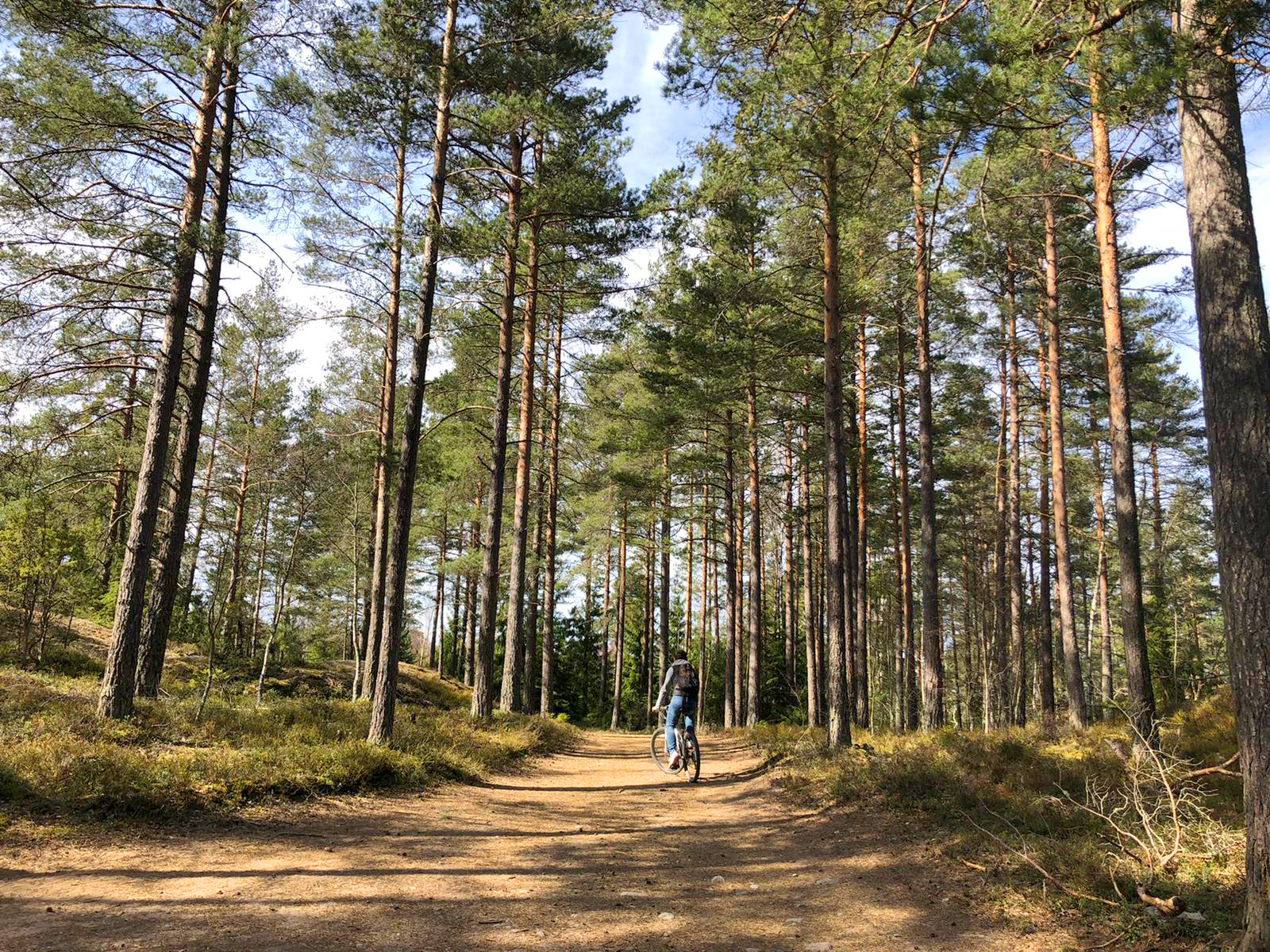 Au panneau Saltsjöbaden[4], traverser prudemment la route. Des panneaux informatifs se trouvent sur la gauche : repérer le chemin forestier représenté en marron sur la carte et dites adieu à la piste cyclable bitumée. Si la piste comporte au début des nids de poule et de la boue (selon la pluie des jours précédents), elle devient ensuite quasiment plate et en très bon état.
