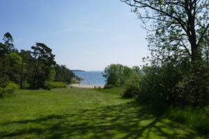 Admirer la vue sur la mer et sur le manoir gustavien du XVIIIème siècle depuis les rochers plats, entre les deux granges en bois rouges, avant de faire demi-tour !