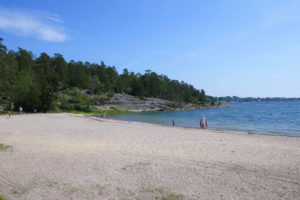 Après une série de montées et descentes, ce superbe passage au milieu des pins et sapins mène à la plage d’Erstaviksbadet, en bas d’une grande pelouse en pente [10] (+1h55).